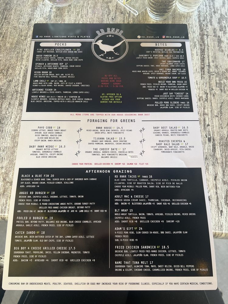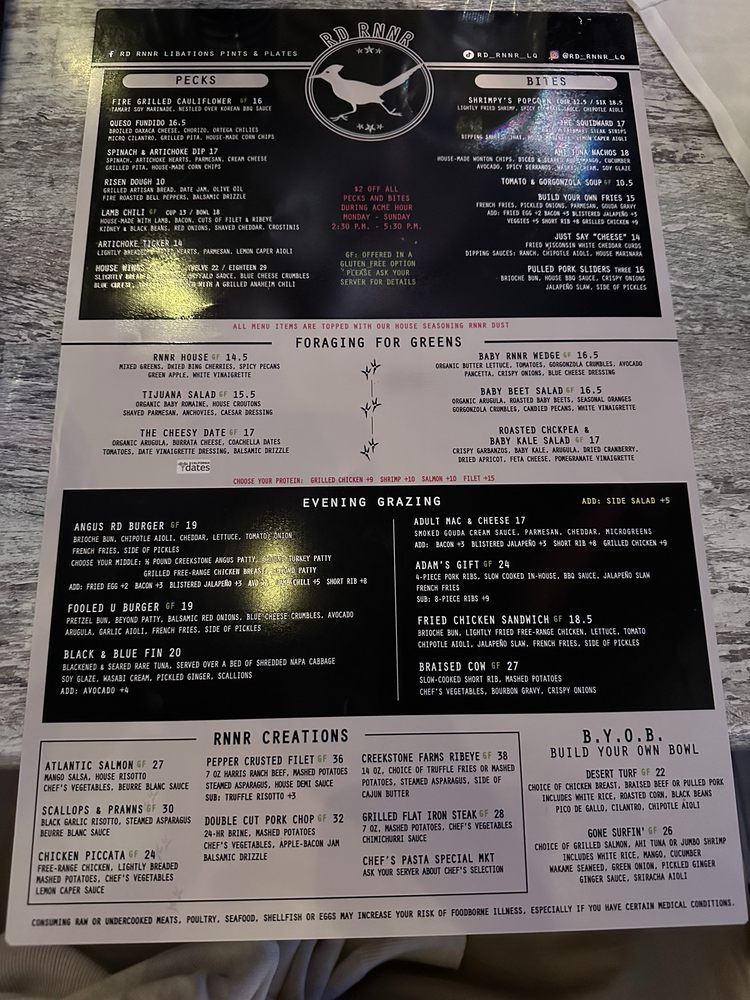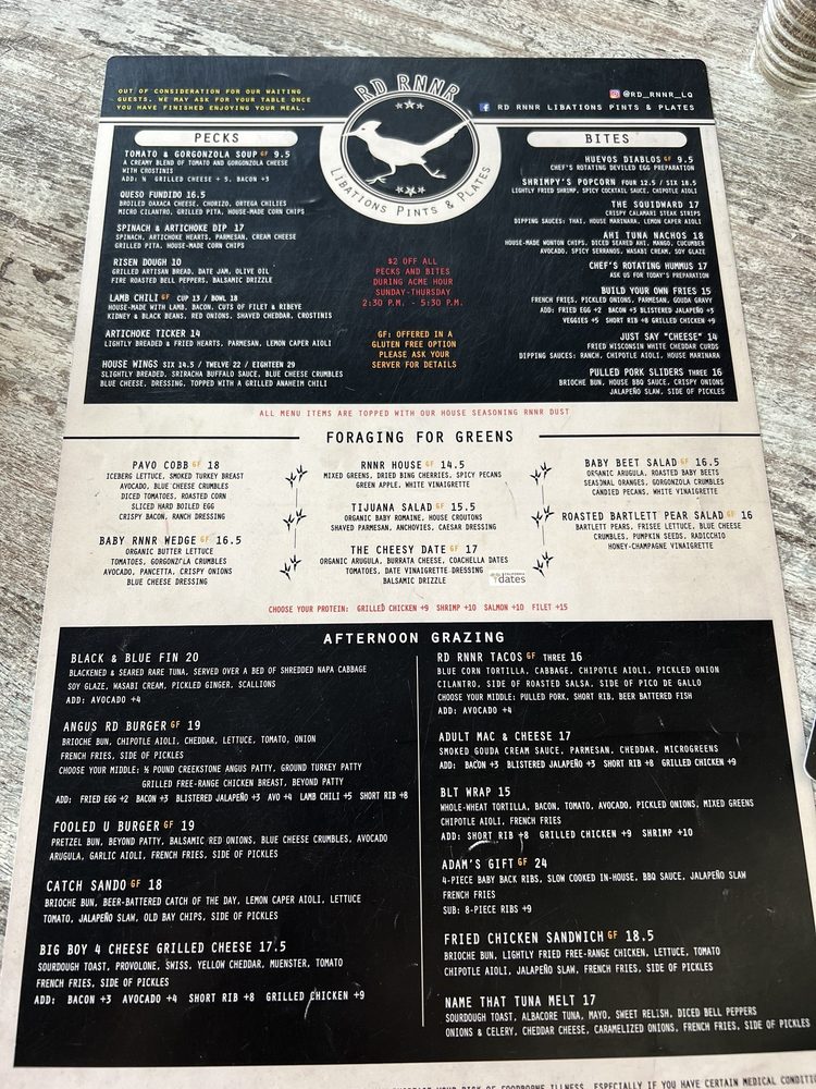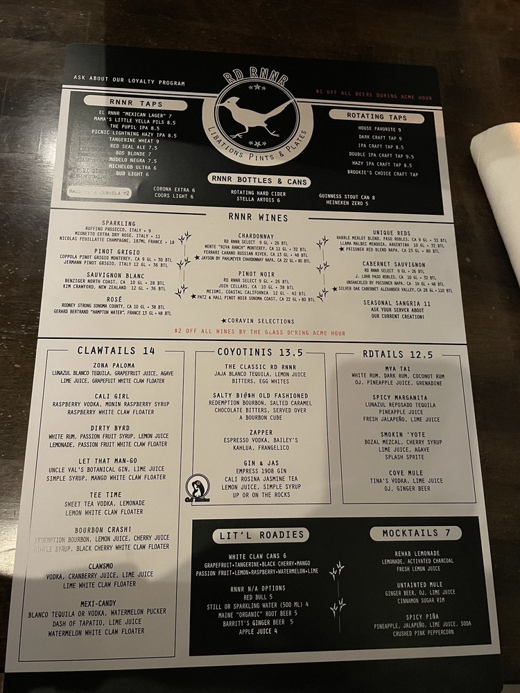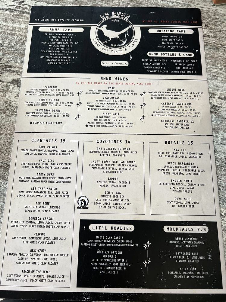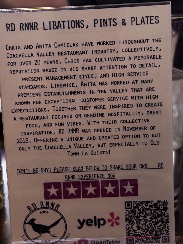 RD RNNR- roadrunner Old Town La Quinta is a trendy cocktail bar and burger spot in La Quinta, CA, offering a variety of New American dishes. With options like vegan and vegetarian dishes, along with wheelchair accessibility and outdoor seating, this spot caters to a diverse range of customers. The menu features a range of options, from poke nachos to risotto, all served with excellent service. Customers rave about the great drinks, attentive staff, and vibrant atmosphere. While some note higher prices, the overall experience and quality of the food make RD RNNR a standout destination. Perfect for a casual but unique dining experience, this Latinx and women-owned establishment is a must-visit in Old Town La Quinta.
